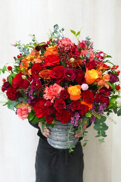 深みのある赤と鮮やかなオレンジを基調にした、華やかで温もりあふれるおまかせアレンジです。