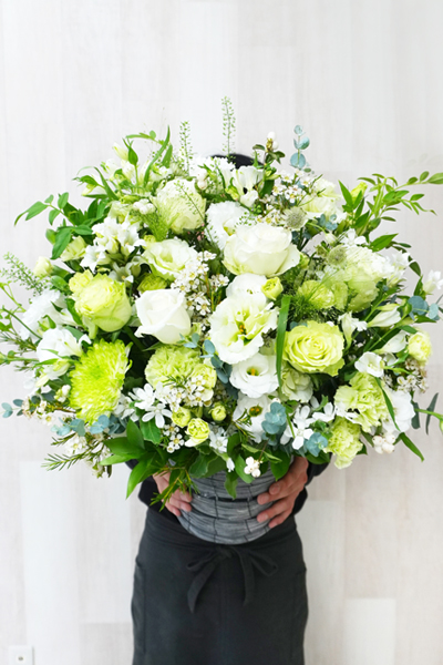 清らかな白とグリーンを基調にした、ナチュラルで上品なおまかせアレンジです。