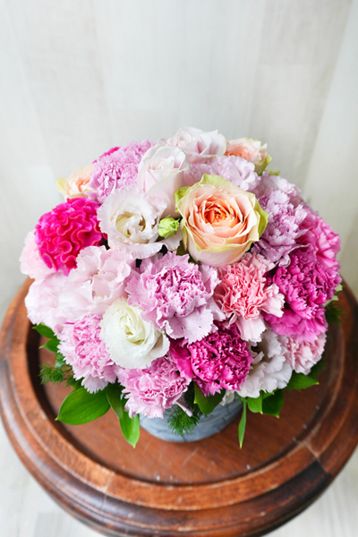 ピンク系の花々でまとめた、上品で温かみのあるアレンジメントフラワーです。
