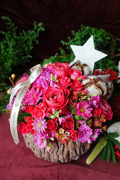 淡めのピンクを基調にした、やさしく上品なクリスマスアレンジメントです。花材はデザイナーが美しいピンクの花々をセレクトし、柔らかい色合いが引き立つナチュラルな雰囲気に仕上げます。そこへ、ふわふわのコットンと、クリスマスらしい輝きを添える星のオーナメントをポイントに、季節感がしっかり伝わるデザインに整えています。