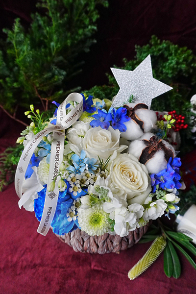 花材はすべておまかせで、白花やブルー系の花々を組み合わせ、澄んだ季節の雰囲気を上品に表現します。ふんわりとした質感が魅力のコットンと、きらりと輝く星のオーナメントをあしらうことで冬らしい温もりとクリスマスらしい可愛らしさをしっかり感じられる仕上がりに。