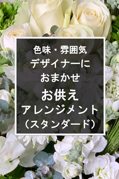 大切な方へのお供え用に心を込めてお作りする、落ち着きあるアレンジメントです。花材は季節や全体の調和を考えてデザイナーがセレクトします。