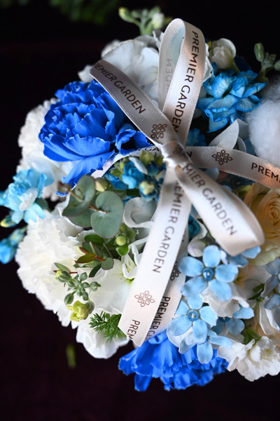 ホワイトにやわらかなブルーが寄り添い、冬の澄んだ空気を感じさせるクリスマスアレンジメントです。清らかな色合いを引き立てる上品なオリジナルリボンと、星のオーナメントのひかりが、まるで雪景色のような凛とした雰囲気を添えます。