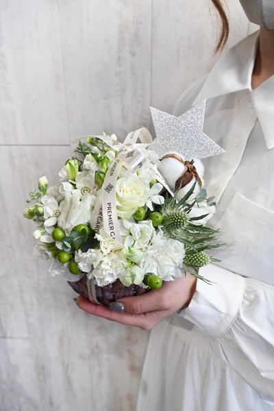 澄んだ冬の空気を思わせるホワイトに、やさしく輝く星のオーナメントとオリジナルリボンを添えた、この季節だけの特別なアレンジメントです。