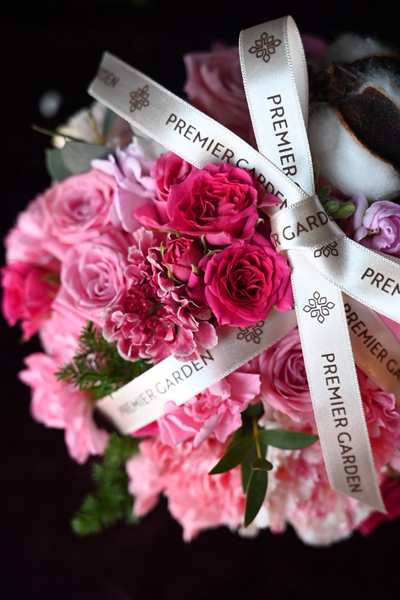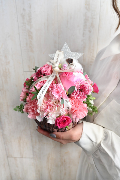 淡いピンクがふわりと混ざり合い、冬の空間にやさしい温度を添えてくれるアレンジメントです。星のオーナメントのきらめきや、オリジナルリボンの上品なアクセントが重なり、特別な可愛らしさを演出します。