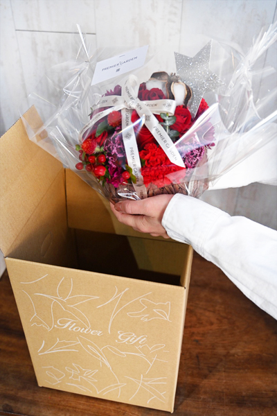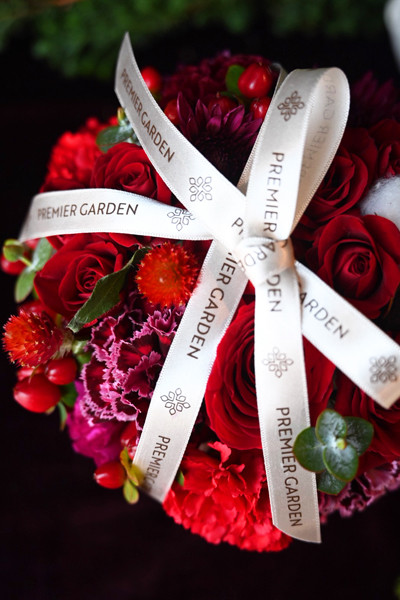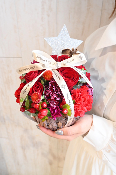 きらりと輝く星のオーナメントと、上品なオリジナルリボンを添えた特別感あふれるアレンジメントです。花材はその日の入荷からデザイナーが相性の良いものを丁寧にセレクトし、華やかさを保ちながらも飾りやすい、ほどよいサイズ感にまとめています。