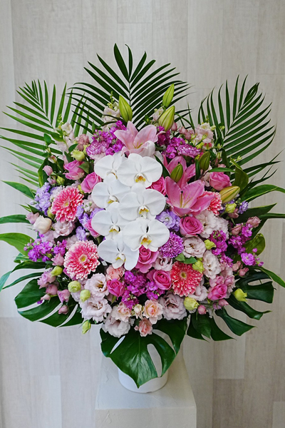 さまざまなピンク系のお花が重なり合い、見る人の心をふっと明るくしてくれる仕上がりに。ボリュームがありながら上品さも兼ね備えているため、開店祝いや公演祝い、記念日の贈り物など幅広いシーンで活躍します。
