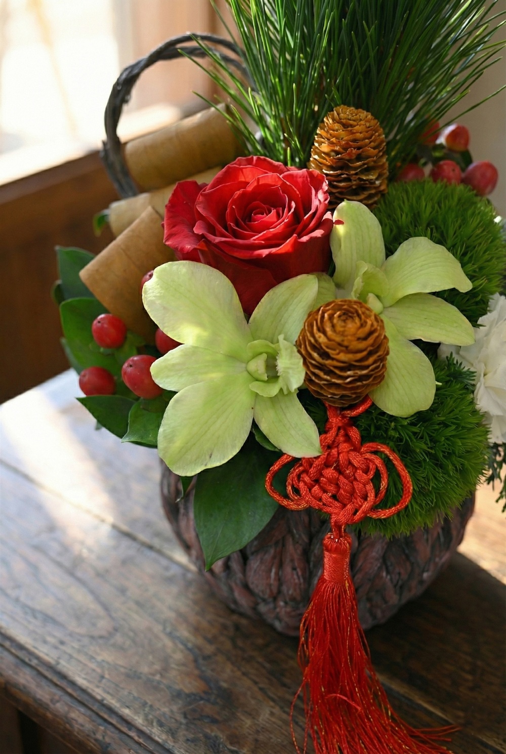 季節感のある花々をコンパクトにまとめた、縁起の良い雰囲気漂うアレンジメントです。
