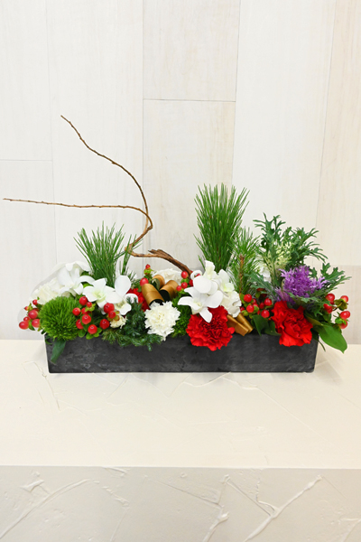花材はおまかせで、白や赤を基調に、その時季ならではの花や実ものを組み合わせ、上品さと華やかさを両立させています。