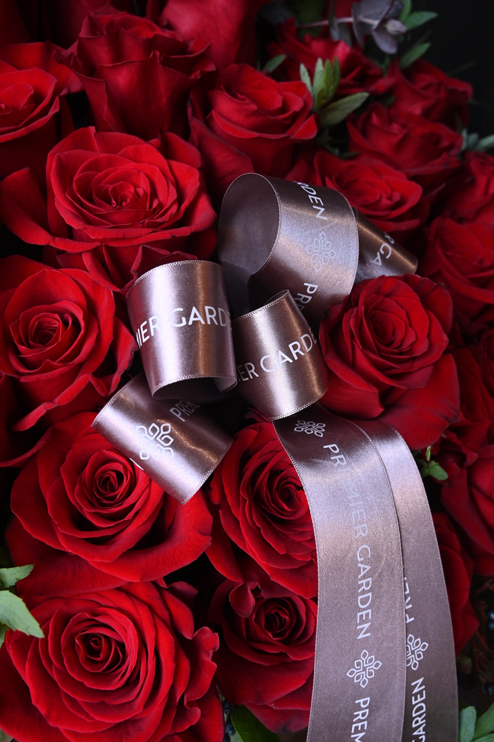 「情熱」「あなたを愛しています」というロマンチックな花言葉を持つ赤バラは、プロポーズや結婚記念日、還暦祝いなど、人生の特別な節目に熱い想いを伝える贈り物として最適です。鮮やかな赤とナチュラルなグリーンのコントラストが美しく、添えられたリボンが全体をモダンに引き締め、ワンランク上の高級感を演出しています。