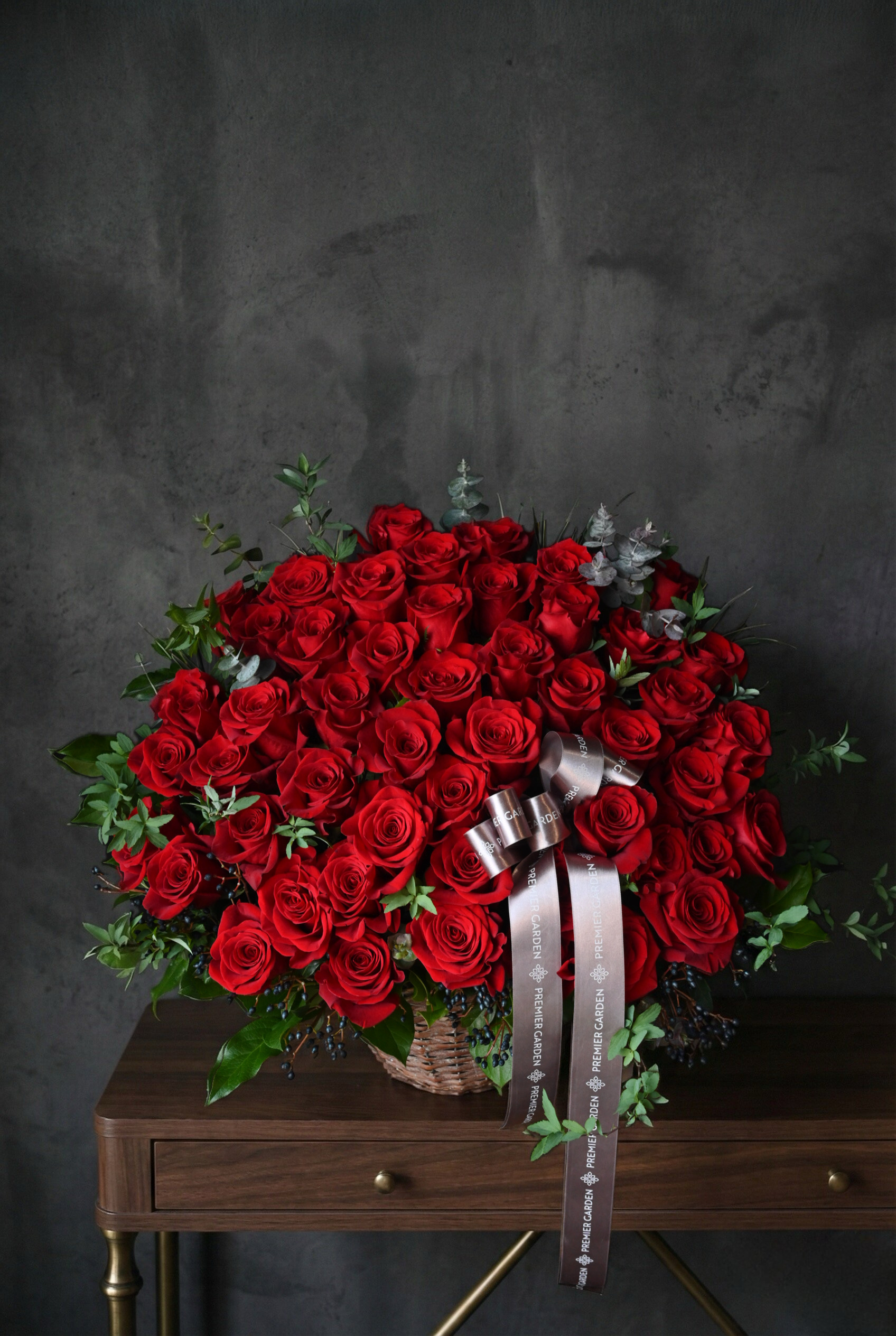 赤のバラを惜しみなく贅沢に使用した、息をのむほど美しくラグジュアリーなアレンジメントです。