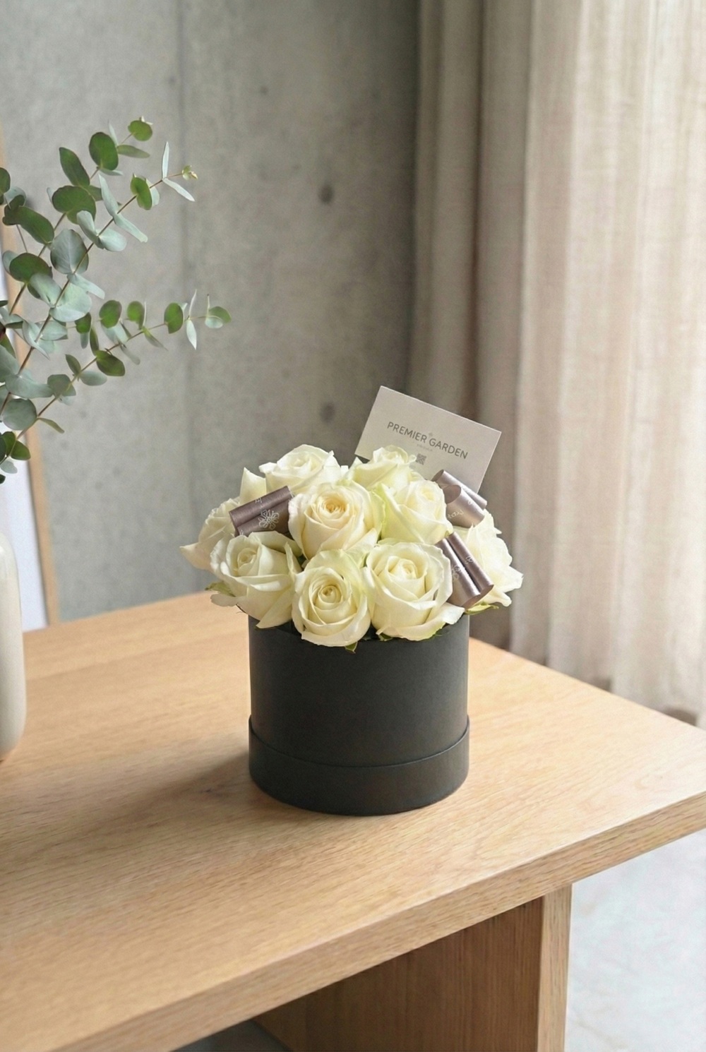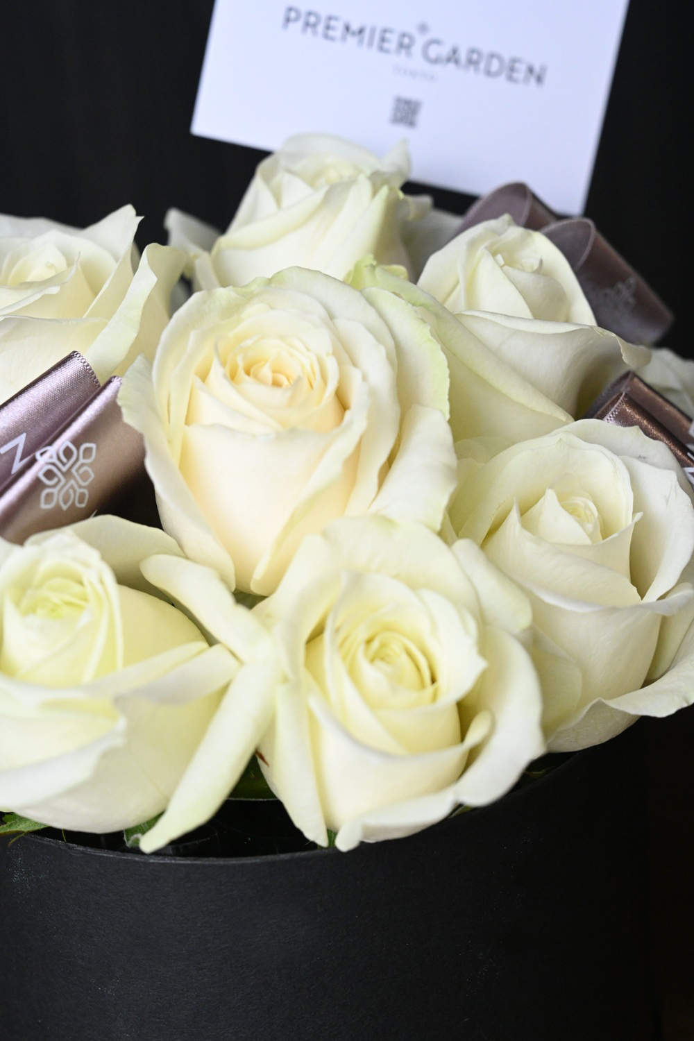 漆黒のボックスに整然と並ぶ白バラは、まるで宝石のような気品を放ちます。余計な装飾を削ぎ落としたからこそ際立つ、無垢な白のグラデーションが、贈る方の誠実な想いを象徴します。