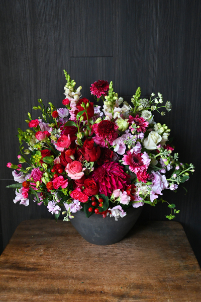 華やかなピンクと存在感のある赤を贅沢に重ねた、ラグジュアリーなフラワーアレンジメントです。