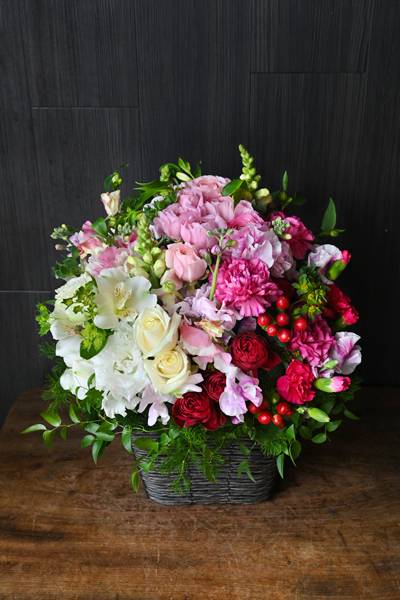 清楚なホワイト、優美なピンク、そして深みのあるレッド。誰もが心ときめく3色を贅沢に織り交ぜた、幸福感に満ちたバスケットアレンジメントです。