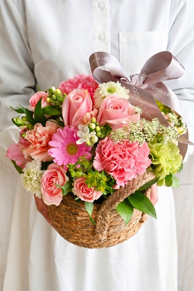 淡いピンクのカーネーションやバラを主役に、アクセントとして少し濃いめのピンクや瑞々しいグリーンを添えることで、お花本来の透明感や可憐さがより一層際立ちます。天然素材のバスケットから溢れんばかりに咲き誇る花々は、画一的ではない自然なグラデーションを描き出し、一輪一輪の形の違いや質感の豊かさを教えてくれます。フラワーアレンジメントの魅力は、こうしたプロの視点で構築された色の重なりを、届いたその瞬間から手間なく楽しめる点にあります。吸水スポンジにお水を足すというシンプルなケアだけで、お花たちの生き生きとした表情を長く愛でることができるため、お母様に「飾る楽しみ」だけを純粋に届けることができます。