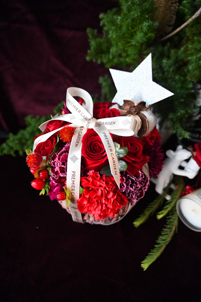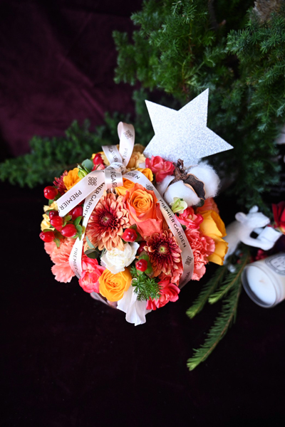 赤を基調にオレンジ系の花をあしらった温もりあふれるアレンジメント