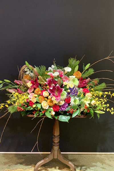 華やかで快活な印象の明るく豪華なアレンジメントフラワー